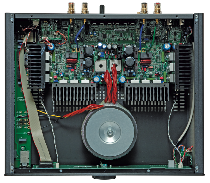 L’intérieurdévoile un colossal transformateur torique non blindé et une carteen verre époxy regroupant la totalité des composants audio à forteteneur CMS. Seuls quelques condensateurs dont quatre de forte valeuren filtrage d’alimentation et les douze transistors bipolaires desortie (soit six en push-pull complémentaire par canal avec contrôleautomatique de température) montés sur dissipateurs à ailettesrestent discrets. La gestion des commandes et du signal infrarouge dela télécommande est opérée par une carte en arrière de la faceavant. Les entrées sont commutées par de la logique à transistorsà faible bruit. Le réglage de volume est confié dans le domaineanalogique à un chip Burr Brown PCM2320 piloté numériquement.C’est un chip PCM2902 qui traite les datas du port USB, et laconversion numérique vers analogique est confiée à un circuitPCM1781 (Delta Sigma 24/192).